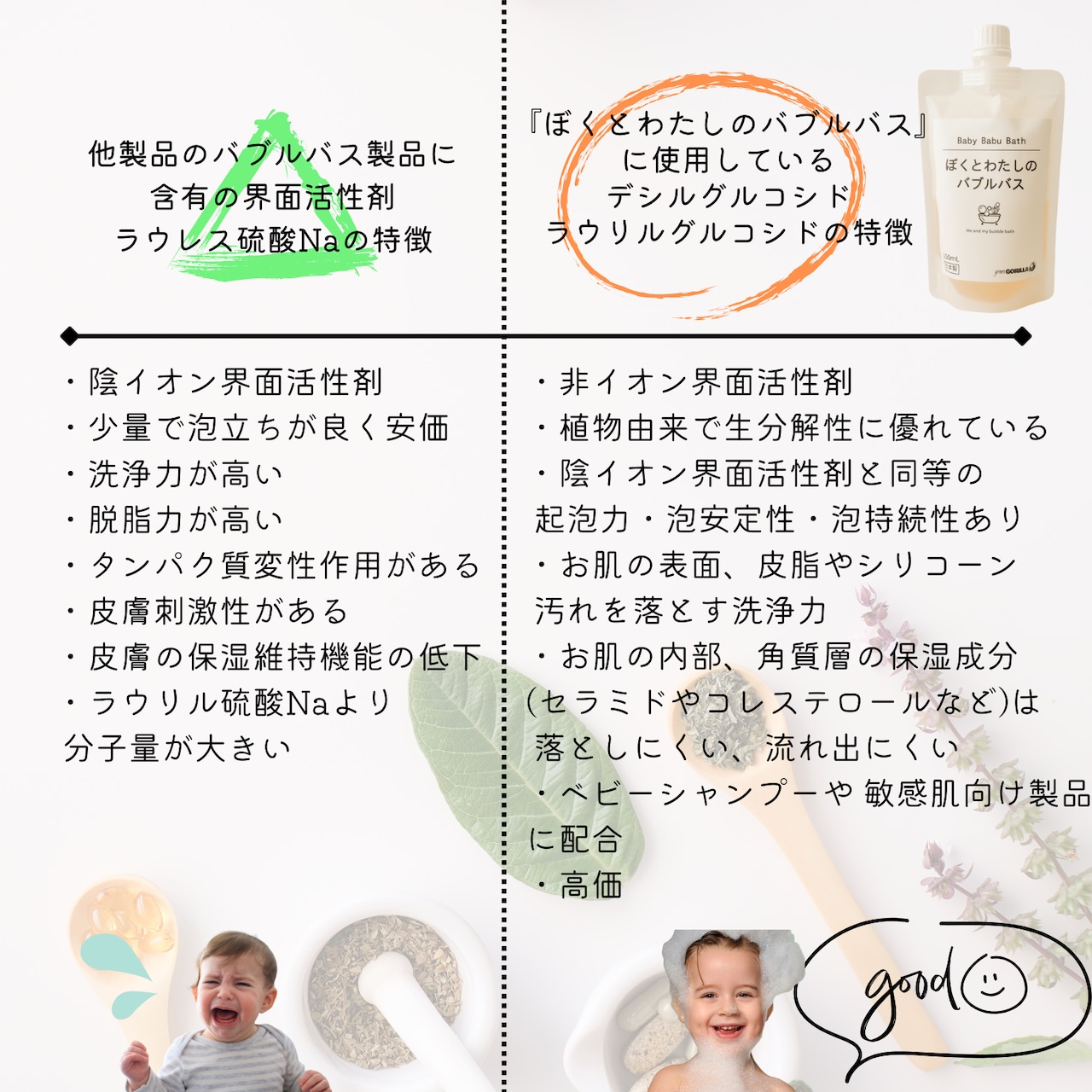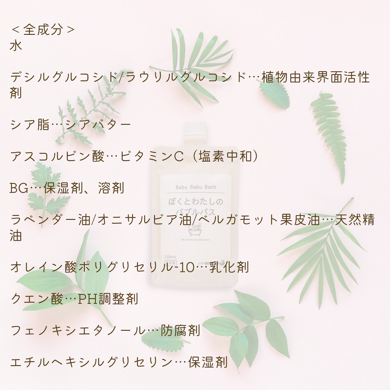 市販のバブルバスのほとんどに入っている石油系界面活性剤やサルフェート(硫酸系界面活性剤)を使いたくない母の、こだわりのオリジナル製品です。