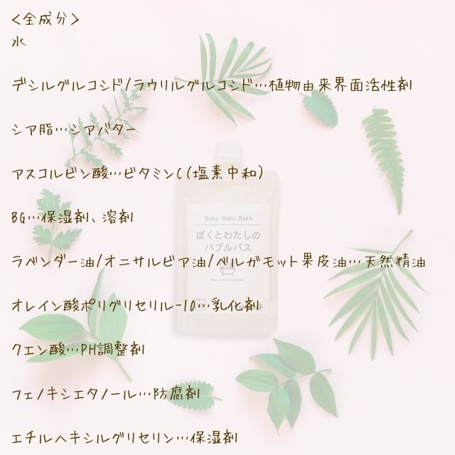 市販のバブルバスのほとんどに入っている石油系界面活性剤やサルフェート(硫酸系界面活性剤)を使いたくない母の、こだわりのオリジナル製品です。